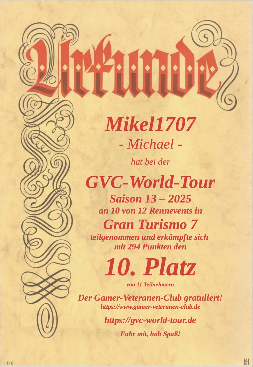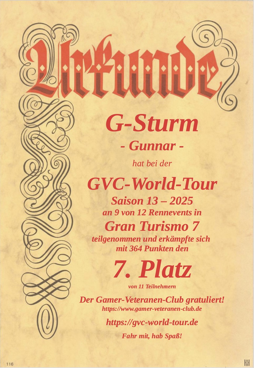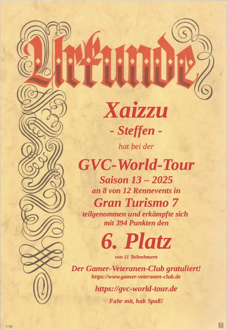 Die Saison 13 der GVC-World-Tour haben wir mit dem letzten gewerteten Rennen erfolgreich hinter uns gebracht. Nun ist es an der Zeit die besten Racer zu ehren und allen Teilnehmern ein großes DANKESCHÖN zukommen zu lassen! Ohne Euch wäre diese Serie, die mir persönlich unglaublich viel Spaß gemacht hat, nicht möglich gewesen!