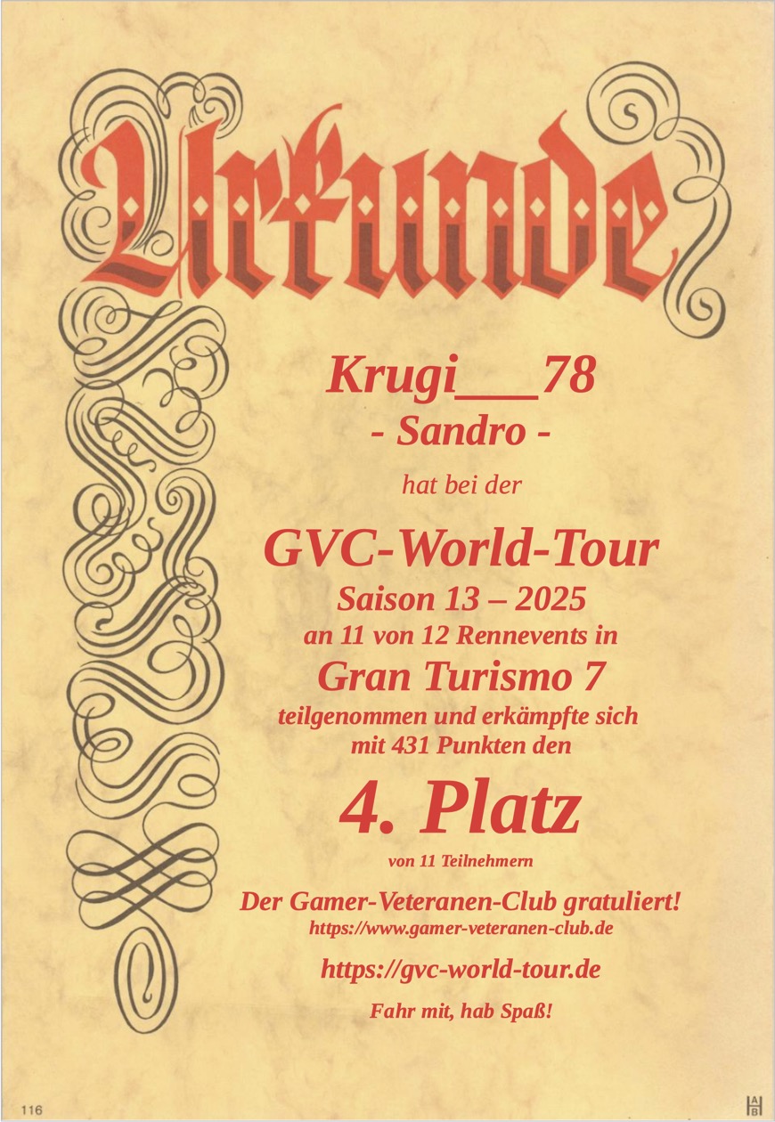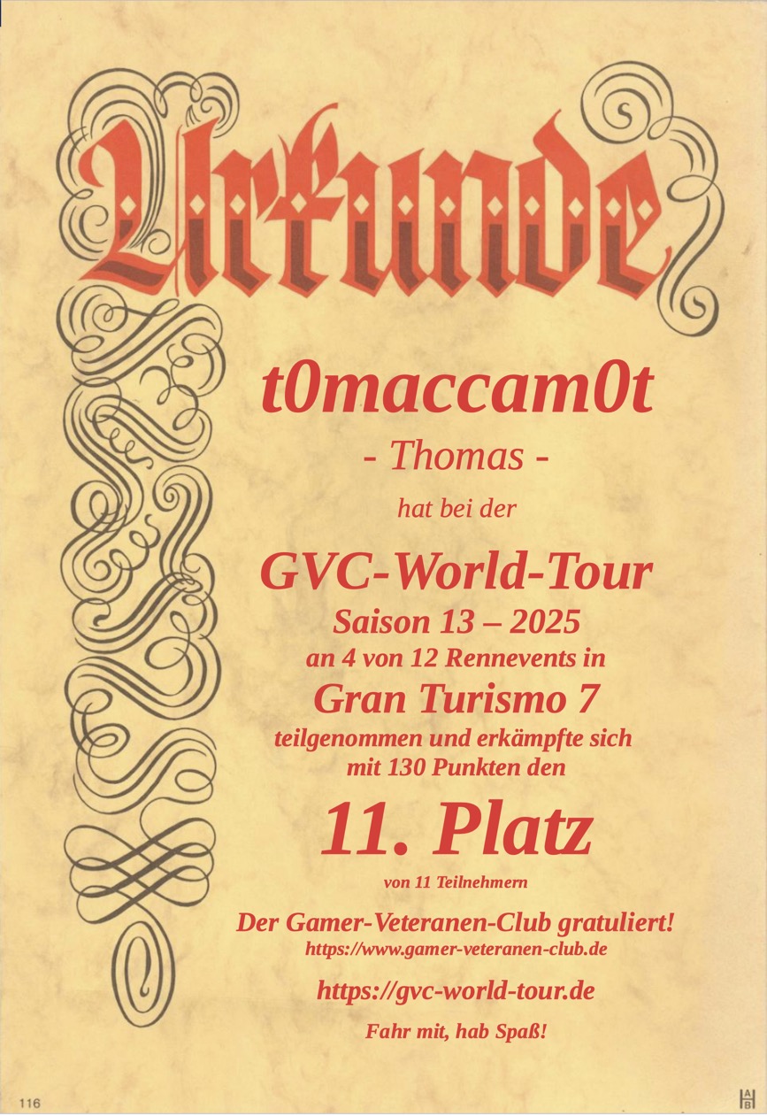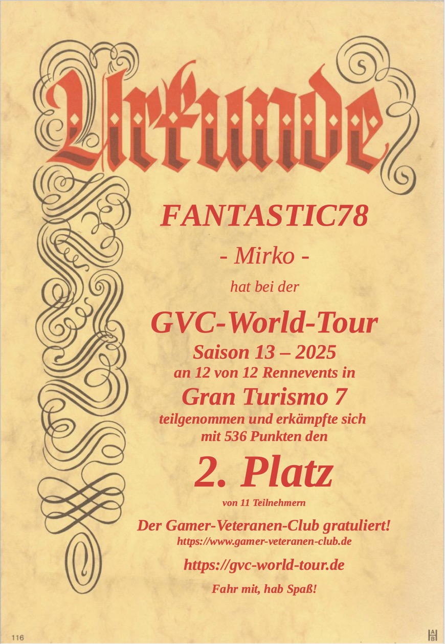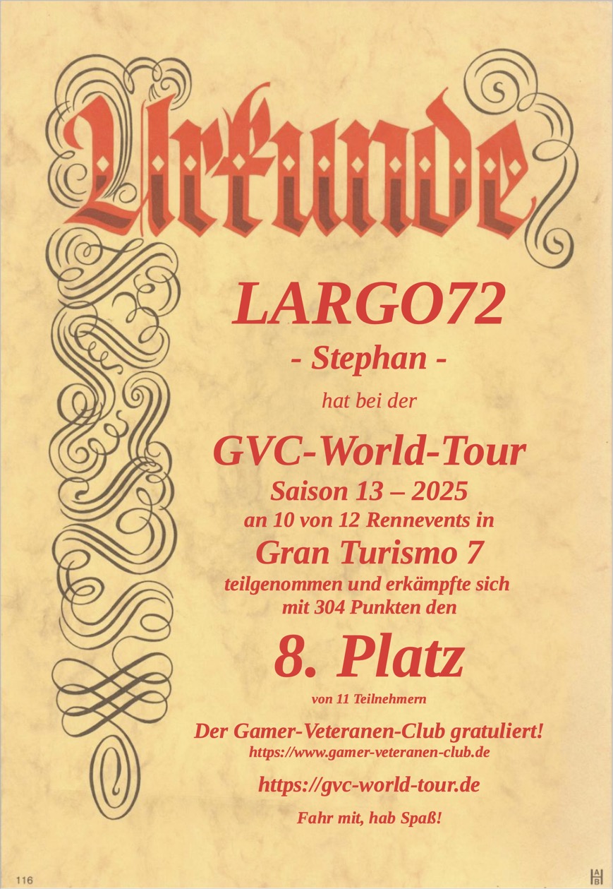 Die Saison 13 der GVC-World-Tour haben wir mit dem letzten gewerteten Rennen erfolgreich hinter uns gebracht. Nun ist es an der Zeit die besten Racer zu ehren und allen Teilnehmern ein großes DANKESCHÖN zukommen zu lassen! Ohne Euch wäre diese Serie, die mir persönlich unglaublich viel Spaß gemacht hat, nicht möglich gewesen!